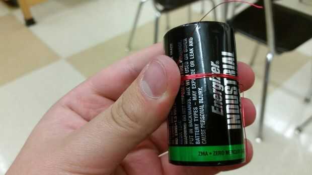 Envuelva el hilo varias veces alrededor de la pila dejando a ambos extremos del alambre en igual longitud (cerca de 2 o 3 pulgadas). Esto crea un círculo perfectamente redondo (bobina) con el alambre. Deslice con cuidado el cable de la batería sin deformación de la bobina.