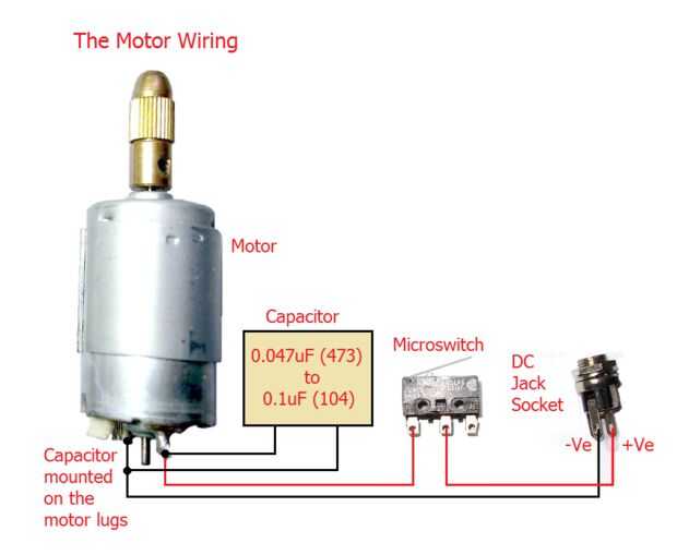 Adjunto un diagrama de cableado para alimentar el motor. Se recomienda tener un condensador (como se muestra en el diagrama) directamente a través de los terminales del motor. Esto es principalmente para que supresión de chispa, para reducir el ruido de RF y a proteger la fuente de alimentación de sobrecargas.