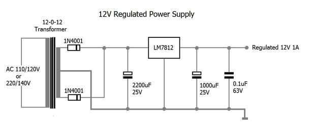 Esto es fácilmente manejado por un regulador de 12V 3 terminales (LM7812) un disipador térmico. Se adjunta un ejemplo del circuito de alimentación. Los componentes no son críticos excepto el transformador y el regulador de tensión. La tensión del condensador no debe ser menor que el indicado.