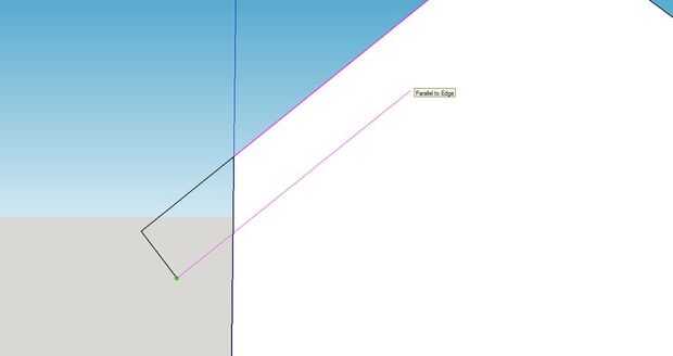 Por último, terminaremos un lado de nuestra azotea utilizando líneas paralelas. Para ello, iniciar una línea, se ciernen sobre la línea que desea que sea paralelo a (la tapa de la azotea) y luego ir en una dirección general que es rosado y dice paralelo al borde. Se puede ver en la foto número cinco que estoy asomando sobre la línea. Tenga en cuenta que una línea de acabado gruesa y un inacabado será fino, como el que estoy arrastrando por aquí. Ahora van en la dirección general de una línea paralela como la imagen de la sexta, y esta vez hacer una línea de cualquier longitud dentro de la casa como tengo (ahora imagen 7). Como no sabemos la distancia exacta entre la pared de la casa y el borde de la azotea, no podemos entrar en un valor. Además de esto, no tenemos puntos particulares en la pared de la casa para ir.