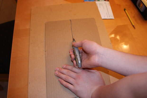 1. mide 4,25 pulgadas lado de 9.5 pulgadas de cartón (S2) con regla (T3) 2. dibujar la línea (T4) por la mitad de la cartulina (S2) 3. Coloque la almohadilla de corte (T1) en cartulina y cortar por la línea con cuchillo (T2)