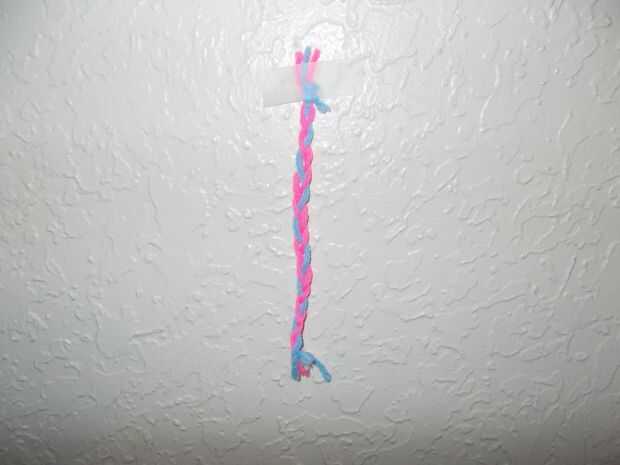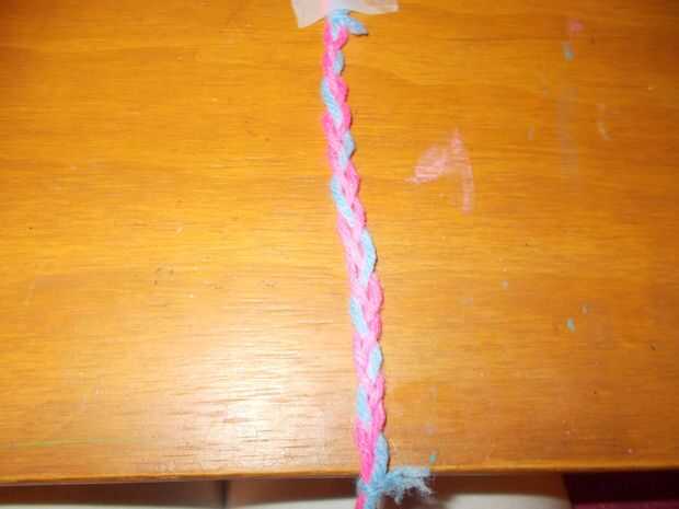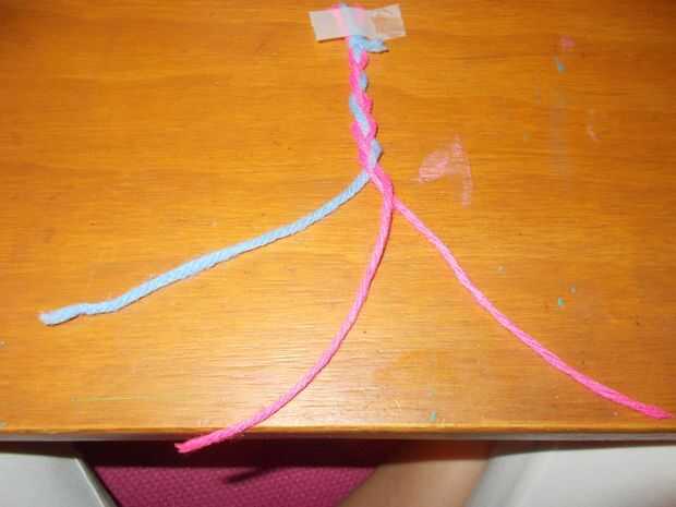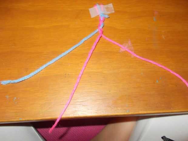 Paso dos: conseguir tres cuerdas de hilo y hacer un patrón y tomar una pequeña franja de la parte superior y un nudo en la parte superior