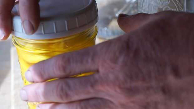 Poner en los sellos y los anillos, pero sólo muy ligeramente. Gírelas hasta que sientes la primera resistencia. Ver la versión en video de este instructable para obtener un ejemplo de cómo firmemente para cerrar la jarra. Colocarle las tapas ligeramente como esto permitirá que la mayor parte de la presión de escape para que al abrir el frasco no fizz en el lugar.