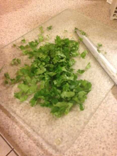 2. corte 1/3 de todos, picar el cilantro finamente y ponerlo en el recipiente con los demás ingredientes.