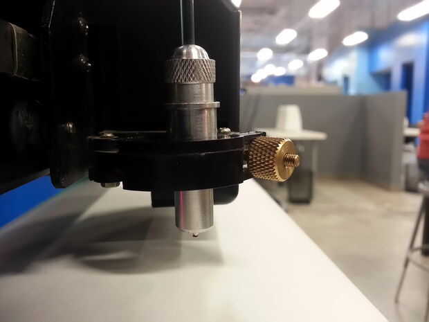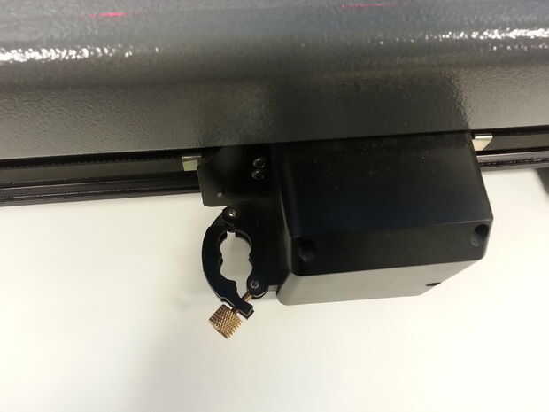 El trazador de pluma en el montaje del carro y en el orificio más cercano a la perilla de fijación de cobre amarillo de la carga. Apretar el tornillo lo suficiente como para que cuando usted tire para arriba, la herramienta de pluma del trazador no se deslice hacia fuera.