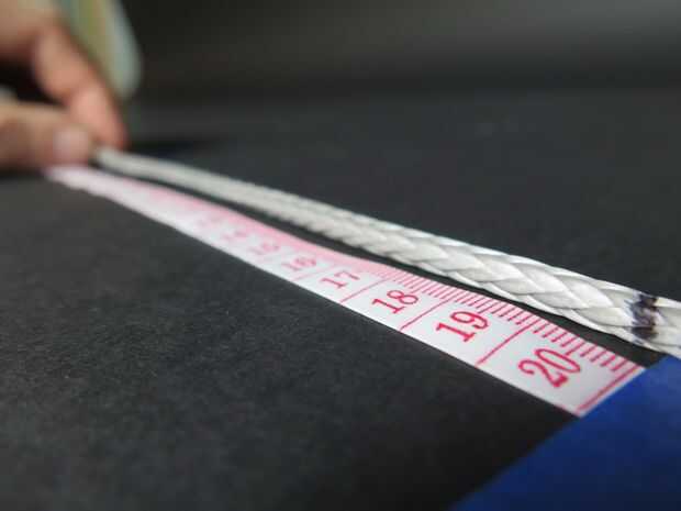 Para la línea de 4mm por ejemplo la medida es 200 mm. (usando métricas porque redondo agradable números en este caso y el vino de dyneema en métrico)