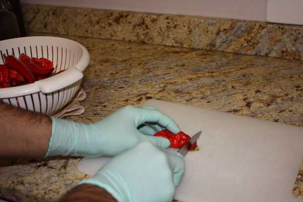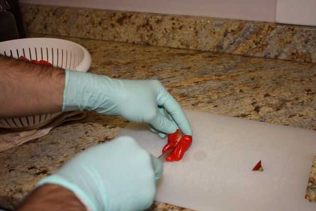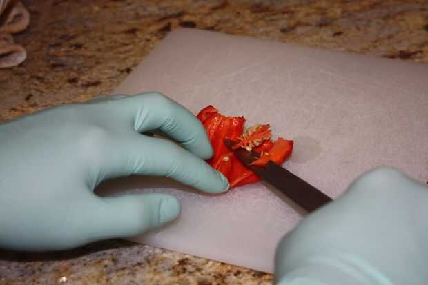 Elegir y lavar el pimiento. Empezar por cortar el vástago y la tapa luego rebanar cada pimiento a lo largo de la longitud de la punta (recuerda tener los guantes en!). Flay el pimiento abierto y luego utilizar la hoja de la navaja para raspar a lo largo de las venas para eliminar las semillas. La vena de un pimiento es el nombre general para la estructura que las semillas se unen también a (la placenta). También puede cortar el pimiento en astillas más estrechos para acelerar el secado.