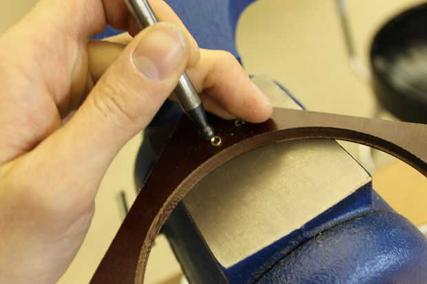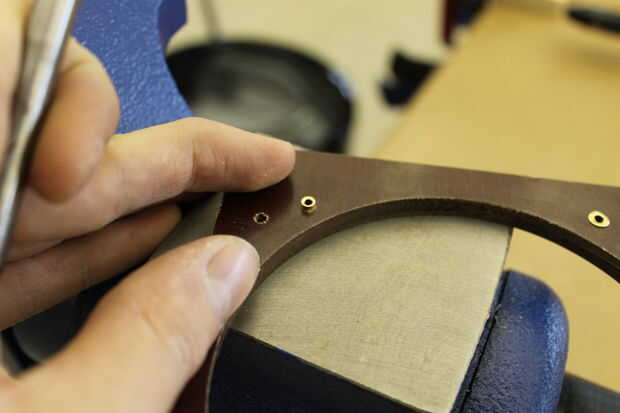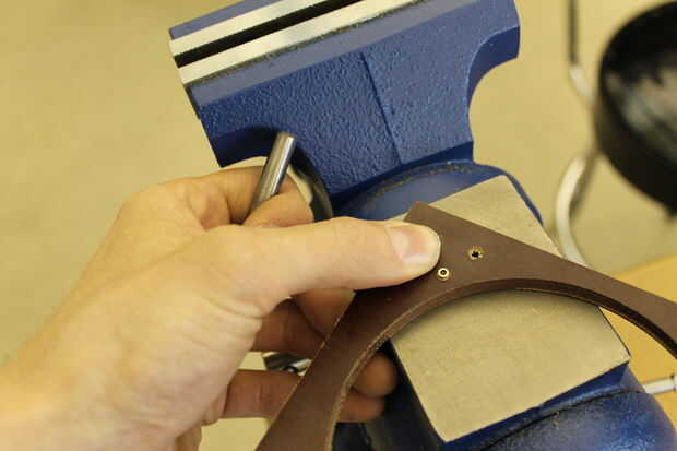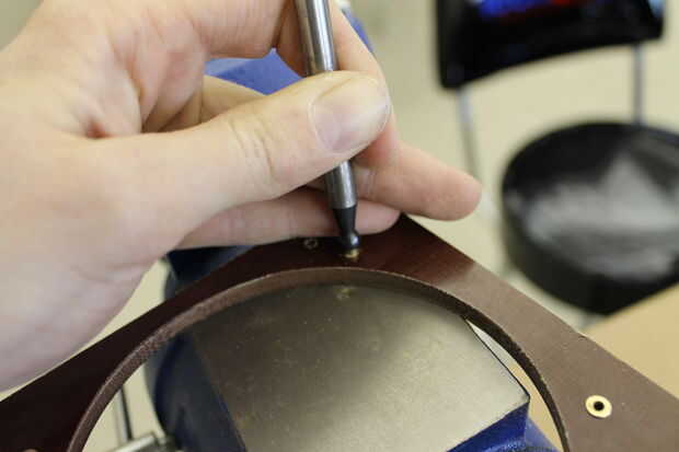 Utilizando el punzón dapping, doblé en la parte superior de la anilla. El extremo de bola empuja el latón en una agradable redondeadas sobre la brida. A continuación, volcó la obra e hice el mismo procedimiento en la parte inferior. Las pestañas son lo que realmente sostenga el ojete en su lugar. También dan a la obra un aspecto agradable.