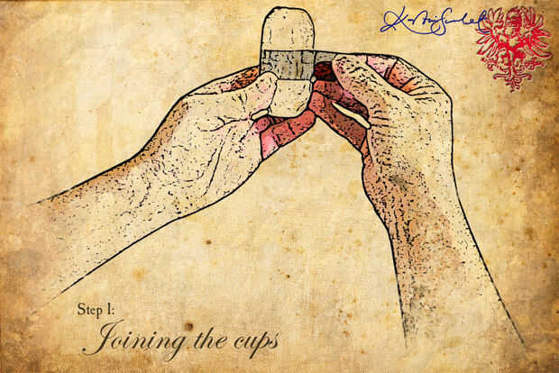 Dos tazas de Marfil hueco se formó y se unen con un trozo pequeño de vendaje adhesivo.