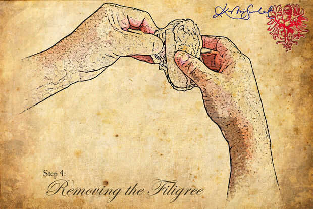 La filigrana fue fijada a la mañana siguiente ya era capaz de eliminar de la forme. Para ello, utilizando el bisturí de un cirujano sharp, primero hice una incisión de arriba a abajo en un lado del huevo en forma de pieza, teniendo mucho cuidado de no lesionar a mí mismo. Entonces empecé a pelar suavemente la filigrana de la anterior. En lugares fue fácil, en otros, resistió un poco mis esfuerzos, pero por el trabajo cuidadoso y el uso ocasional de uno de nuestros cuchillos de mantequilla, era capaz de trabajar la filigrana libre todo redondo y deslizar el huevo en forma de forme hacia fuera del interior de la celosía de filigrana.