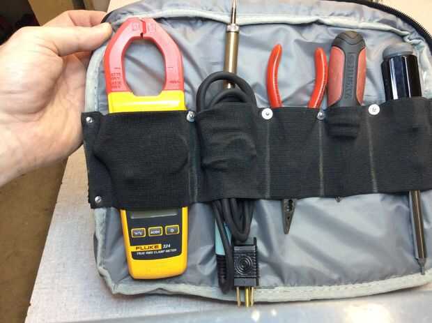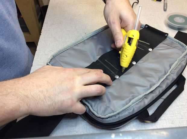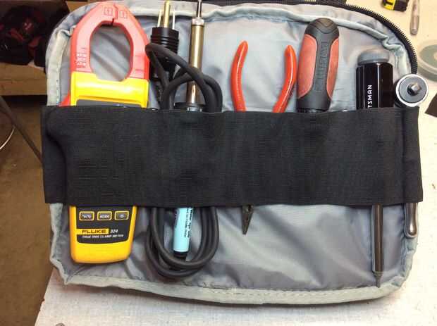 Ahora debe tener la banda pega y clava en su lugar con un montón de holgura colgándose de un extremo. Doble sobre y pegue sobre el almacenaje de herramienta que acabamos de crear. Esto logra dos cosas: una, oculta las marcas de tiza, así como sus remaches. Dos, crea más espacio útil de almacenamiento.