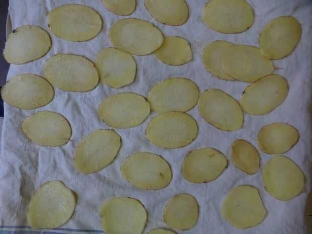Tan pronto como usted corta las obleas, repartirlos sobre un paño limpio. La humedad en las obleas de patata será absorbida por la tela. Esto hará que las patatas para cocer rápidamente, así como consumir menos aceite al freír.