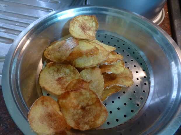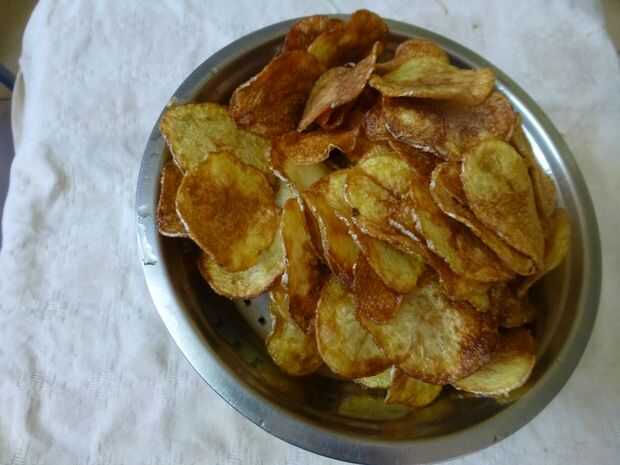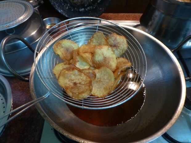 Una vez que las vueltas de las obleas de patata a café dorado retirar de la sartén y escurrir el aceite.