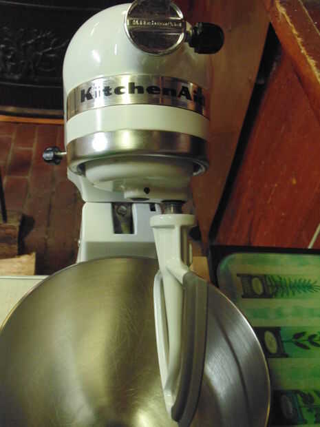 Poner la mantequilla ablandada (no blanda) en el recipiente de la batidora junto con la manteca. [Este caballo de batalla de un mezclador fue un regalo navideño de mi esposo hace 12 años. Le pedí que me llego un modelo reformado y ha sido un sueño desde entonces - pero creo que necesita algunas etiquetas de la llama, no?]