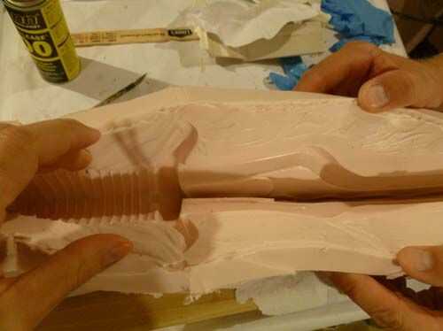 Se trata de un molde de la 2 parte. Tuve que esperar para que la primera mitad curar antes de retirar las paredes de la caja y arcilla y verter a la segunda mitad. Smooth-On recomienda un tiempo de curado de 24 horas. Una vez que la silicona de la primera pour se cura, se voltea el molde y retirar de la arcilla. Salí de arcilla para el vertedor. Para los canales de la burbuja de aire, corta los cuidadosamente después de la segunda parte está formada. Necesito para crear el vacío. Utilice un paño húmedo para limpiar el prop y silicona. Estaba muy feliz de ver que la primera mitad salió perfectamente.