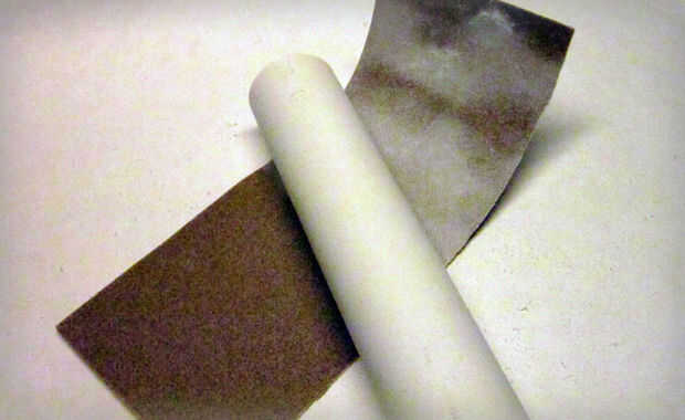Retire la capa brillante y tinta de impresión en la cara de PVC con el papel de lija. Si la tinta está dando problemas, le da algunos problemas... con acetona. La PVC debe tener un agradable acabado mate.