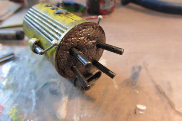 Básicamente, cortar una longitud pequeña de alambre fino y doblar a la mitad a lo largo. Luego, corte un poco de su tubo de tinta a la longitud de la mitad el cable. Deslice sobre el alambre y pegar en su lugar. Ahora necesitas encontrar algo para tapar la fea del final de su brazo. Usé una vieja hombrera de Warhammer 40K, lijada hasta que era evidente. Las manos son sólo gotas de caliente pegue cuidadosamente squeezed(?) en el extremo del alambre. Repita este proceso con el otro brazo y luego pegarlos tanto en los lados de su modelo.