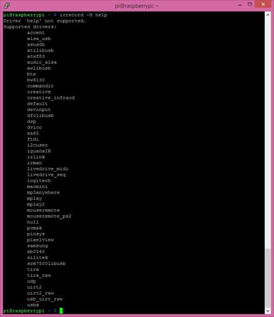 "irrecord" necesita conocer el dispositivo para leer los datos IR de. Tiene un comando -H para muchos dispositivos predefinidos. En el tipo de ventana de terminal