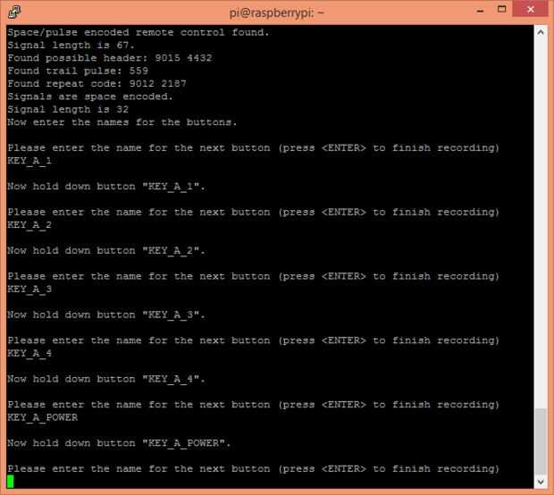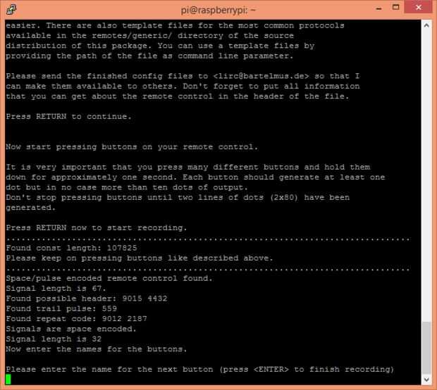Una vez que tenemos dos líneas de puntos, el programa nos pide que nombre los botones. Si uno no ha usado la opción - n, cada nombre debe provenir de la lista generada con el comando "irrecord -l". Hemos utilizado la opción - n para que podamos hacer nuestros propios nombres. Voy a crear nombres que son similares a los del espacio de nombres. Ya que tengo una sección y una sección B, voy a utilizar los nombres de KEY_A_x y KEY_B_x donde x es la 1,2,3,4 y el poder. El botón de reset será KEY_RESET.