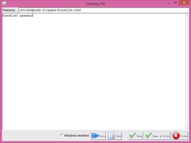 Crear el archivo /etc/modprobe.d/iguana-blacklist.conf con el contenido de la lista negra iguanair