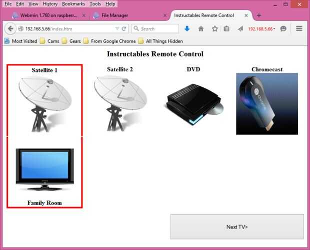 Yo uso un http GET, ya que utiliza una cadena de consulta en la url. Esto permite que uno escriba un url en la barra de direcciones del navegador para enviar los códigos dominantes. El archivo cgi es un script de bash que extrae el código de clave de la cadena de consulta y utiliza el comando "irsend" con esa clave. El interruptor HDMI puede controlar entradas a dos televisores. Puedo cambiar entre estos televisores con botones grandes. Los cambios de nombre para indicar para que TV las entradas están siendo controladas. Los comandos se almacenan en matrices de javascript doblemente indexada. Los botones siguiente y anterior cambian el primer índice para que coincida con el televisor que se controla. El índice 2 º accede a la clave adecuada para realizar la función dada.