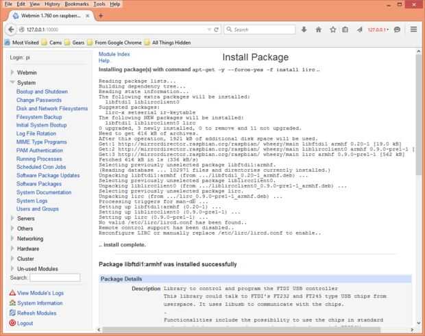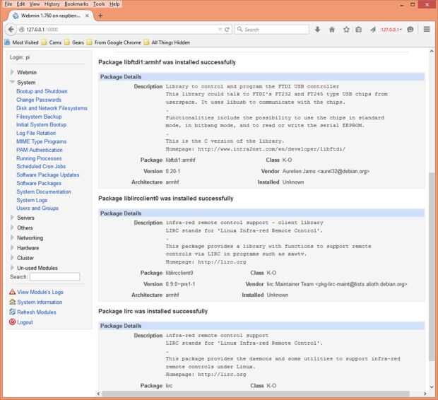 Webmin instalar LIRC y sus dependencias. Las pantallas de arriba muestran los resultados.