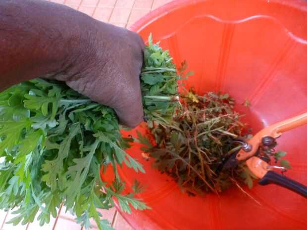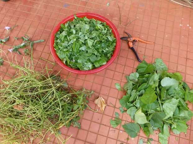Para hacer una evaluación de cuánto las malezas hacen un kilogramo, he pesaba aproximadamente un kilogramo de picado encima de malas hierbas en una bolsa. La cesta rojo en la imagen aquí contiene bolsas de aproximadamente dos y una mitad, es decir, 2,5 kilos de hierbas picadas listo para ser pulverizado.
