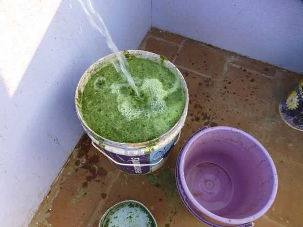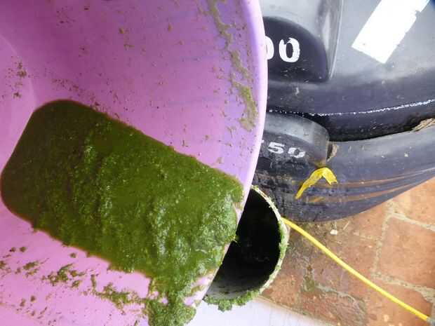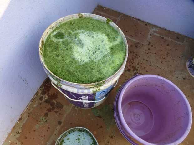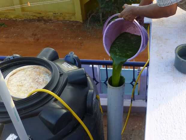 He utilizado una cubeta de 20 litros capacidad para transferir y diluir las malas hierbas pulverizadas cerca del punto de alimentación. Más agua se agrega para arriba hasta el borde de la cubeta a 20 litros. La mezcla triturada diluida entonces se introduce en el digestor de biogás a través del tubo de alimentación. Esto es un proceso repetitivo y puede hacerse todos los días para obtener la producción ininterrumpida de gas.