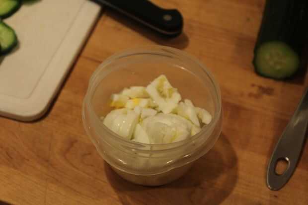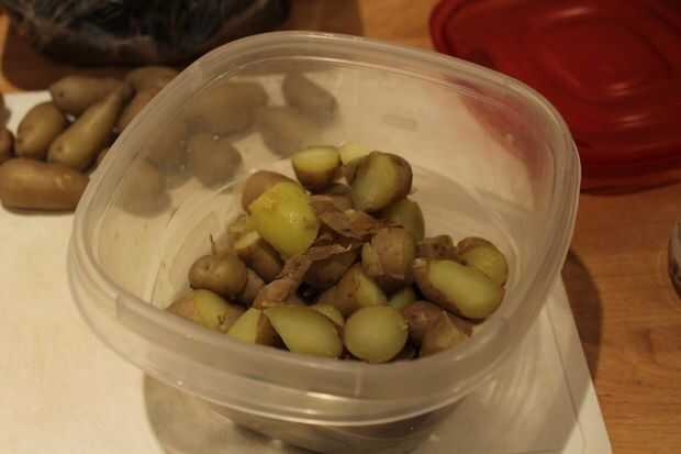 Una vez enfríe para tocar, cortar las patatas en mordedura de pequeño tamaño y cáscara de huevos. Corte los huevos una vez peladas en rodajas finas, utilizando un cortador de huevo de alambre, si tienes uno. Almacenar trozos de patata y huevo de piezas en dos recipientes de plástico sellados separados en nevera hasta que esté frío y listo para usar para la ensalada.