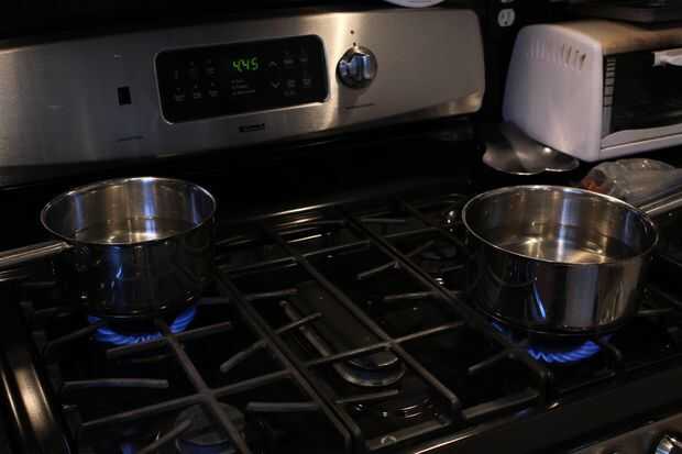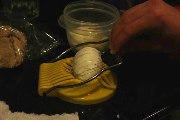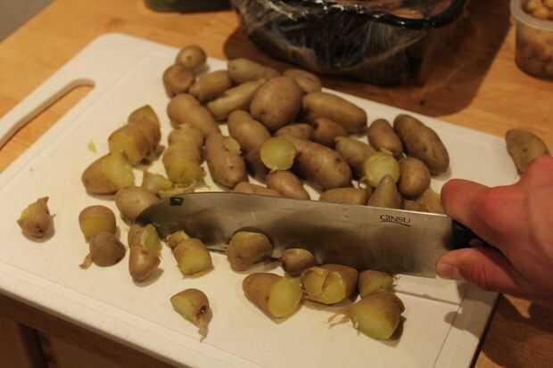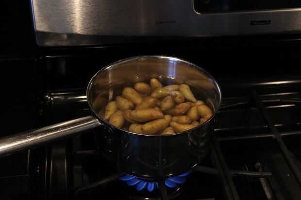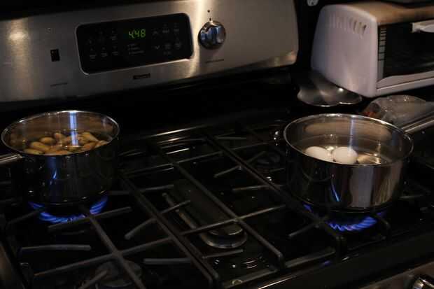 Para preparar huevos y patatas, en dos sartenes separadas, uno grande y uno mediano, poner agua sobre ⅔ los lados de las cacerolas. Llevar agua a un estado casi hirviendo en ambos. En la olla grande, coloque cuidadosamente en todos los huevos y ajuste el temporizador a 20 minutos. En la otra cacerola, volcado en las patatas y ajuste el temporizador a 20 minutos (o a la vez para ambos) o hasta que las patatas son muy suaves. Cuando termine, sacar huevos y patatas pan, desechando el agua.