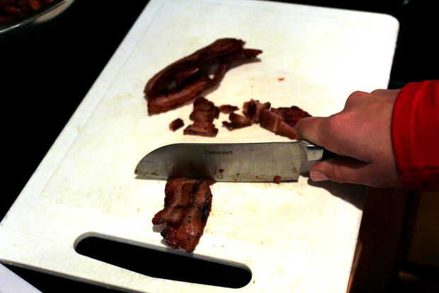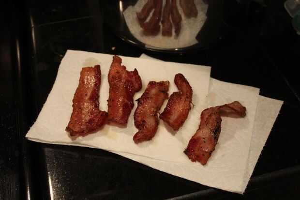 Para preparar tocino, caliente una sartén a fuego medio y los cuatro pedazos de tocino en. Chisporroteo en ambos lados hasta que ambas partes están perfectamente oscuro. Coloque pedazos de tocino en una toalla de papel y presione para eliminar la grasa extra. Cortar el tocino, una vez fría, en trozos pequeños, como se muestra.