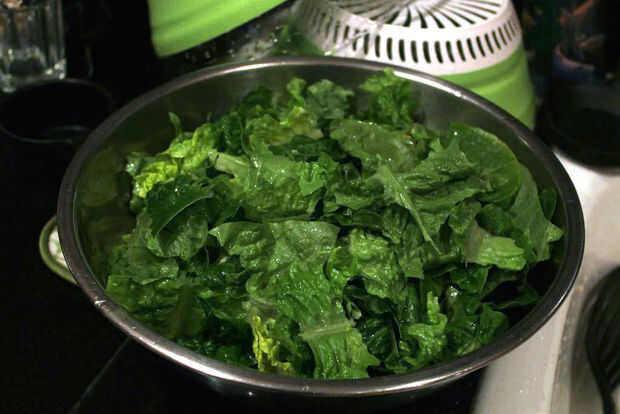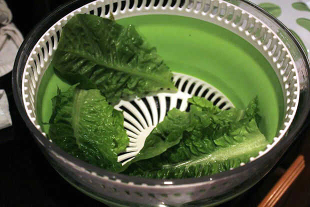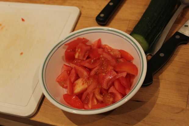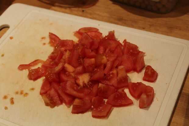 Cortar los tomates en trozos de media pulgada con un cuchillo de sierra, después del lavado y también lavar lechuga bien, romper en pequeños pedazos de tamaño de la ensalada, coloque en una hoja de secadora y girar rápidamente hasta que la mayoría del agua es escurrido.