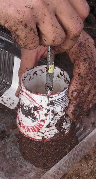 Pack el suelo suavemente, pero firmemente con el émbolo. Esto debe "del asiento" el suelo en el molde.