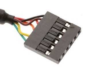 Agarra su nuevo cable USB FTDI y centrarse en el conector negro enfrente del conector USB. Usted verá algunos enchufes de clavijas hembra y algunos hilos de color detrás de estos conectores. Sólo tenemos que hacer dos conexiones. Búscate algunos cables puente macho/macho, si no tienes algunos.
