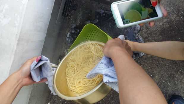 Esta receta requiere salsa de pesto de albahaca congelada adelantado según el primer video. El pesto puede ser fabricado en grandes cantidades y durante largos periodos para comer rápido a muchos en tiempos posteriores. La salsa se crea con el espagu