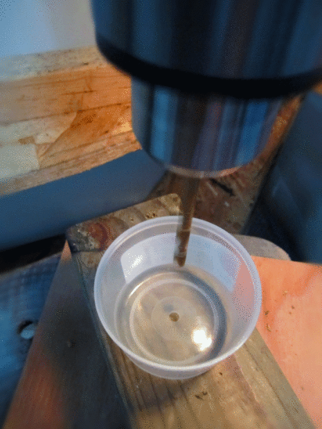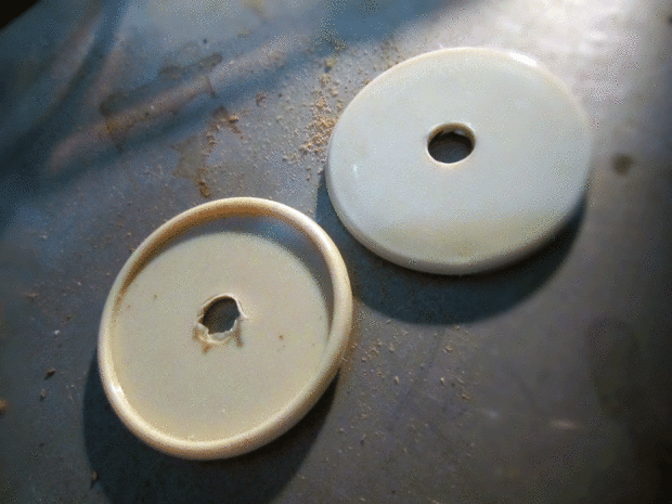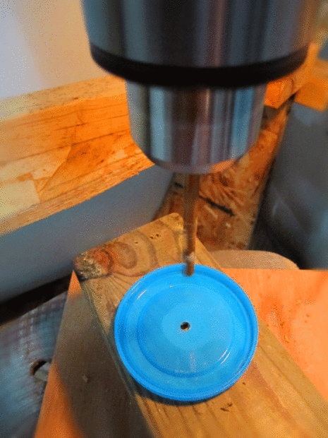 utilicé una prensa del taladro para perforar cuidadosamente 1/4" agujeros en el centro de dos de las tapas, el centro de la taza de plástico y el centro de las arandelas de plástico (estos son cursores de muebles realmente). Nota de PRECAUCIÓN: objetos pequeños son difíciles de controlar y pulsado cuando se taladre en ellos. El taladro a la rpm lenta y poco a poco la 1/4 broca en contacto. Alternativamente puede iniciar con una broca más pequeña y trabajar hacia arriba a través de los tamaños hasta llegar a 1/4", pero de cualquier manera tenga cuidado.