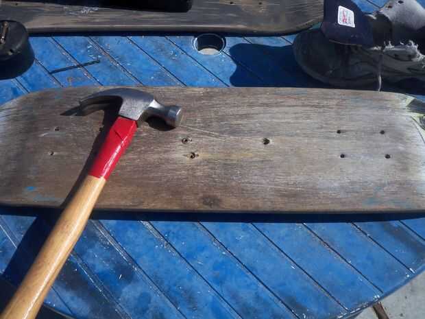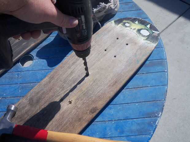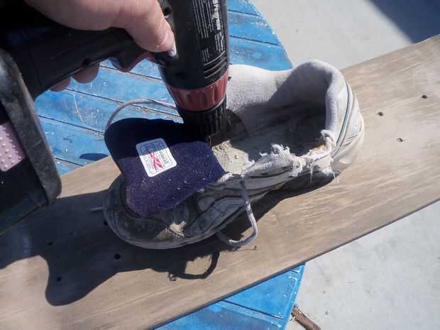 Empezar por centrar un zapato en la cubierta del patín. Perfore tres agujeros a través de la parte inferior de la zapata y la cubierta. Perfore un agujero cerca de la sanación y dos agujeros cerca de los dedos del pie. Esto hará que la estación de esquí más estable.