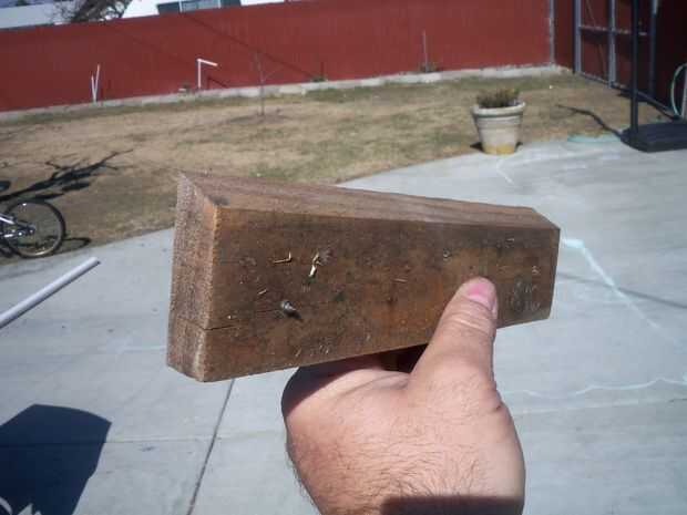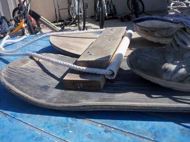Función de seguridad #2: retención de la cuerda de la remolque. Agarrados a la cuerda de la remolque es resistente en los brazos y estragos con equilibrio de esquiador. La cuerda de la remolque toma de la tensión de la esquiadora y pone en los cielos. Esto hace esquí muy fácil, incluso para el más pequeño de los niños. Cortar una pieza de 10 pulgadas de madera en un ángulo 30 grados. Tornillo de este pedazo de madera para el soporte delantero, como se muestra. Esto creará un "bolsillo" para la cuerda de la remolque.