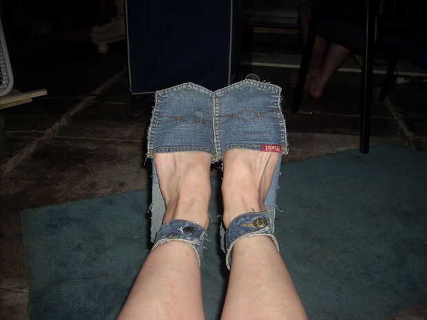 yo no puedo tomar el crédito para el diseño de sandalias básicas. Sin embargo, las correas de tobillo eran mi idea. Eran bastante fáciles de hacer. Solo tomé lo que había sido la cinturilla y quitar las presillas, entonces yo cortar la banda por la mitad. Con un poco de imaginación y manos constantes cosí las correas en. Oh, me añadir un poco de tela extra en la parte delantera y trasera de las sandalias. Lo sentimos la mirada tan cruda, clase de quería mirar de esa manera. Son un poco grandes en mis pies, por lo tanto, las correas. Gracias por la inspiración Giannyl