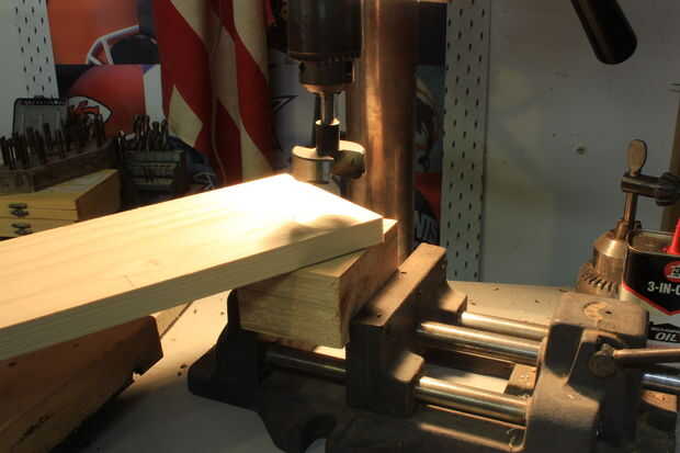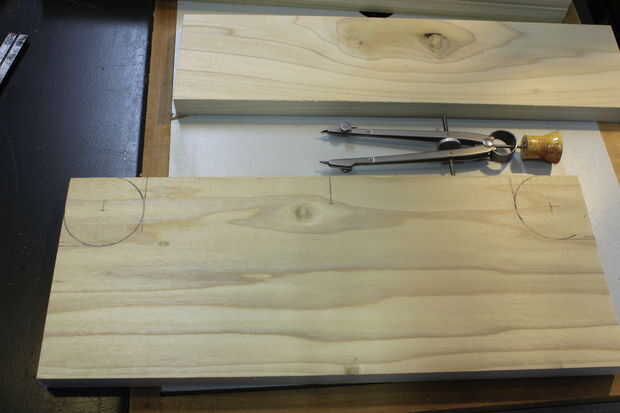Medido hacia arriba desde la parte inferior de la cabecera 2.5"(que es el mismo ancho que el lado y el pie de tableros). Entonces medí 2" en cada lado y 2" hacia abajo desde la parte superior. Luego usé un 2" forstner bit y mi taladro para cortar un círculo en cada esquina. a continuación, utiliza mi sierra de banda para eliminar las esquinas afiladas y pegado un pedazo de madera a la parte superior para ser moldeado. Por último, la arena de la cabecera.