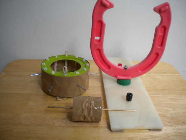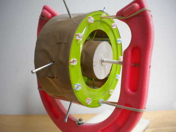 Coloque bandas de goma en los talones de la herradura cubierta estator en lugar de suspender. Inserte el eje a través de un agujero en el talón, deslizando los espaciadores y el rotor en su lugar como se muestra. Pivotante clavos según sea necesario, por lo que están casi tocando la superficie del rotor.