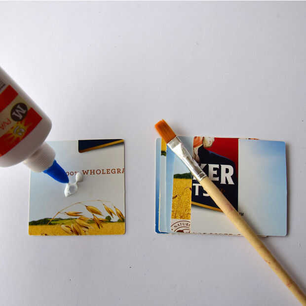 Usando el pegamento blanco, cuidadosamente pegan las plazas en las pilas de seis. Use una capa fina de pegamento y difundirlo por todas partes cubriendo la superficie de cada cuadrado. El pegamento debe ser pegajosa, no resbaladizas para que las capas no se deslizan alrededor. Asegúrese de que cada capa está perfectamente alineado.