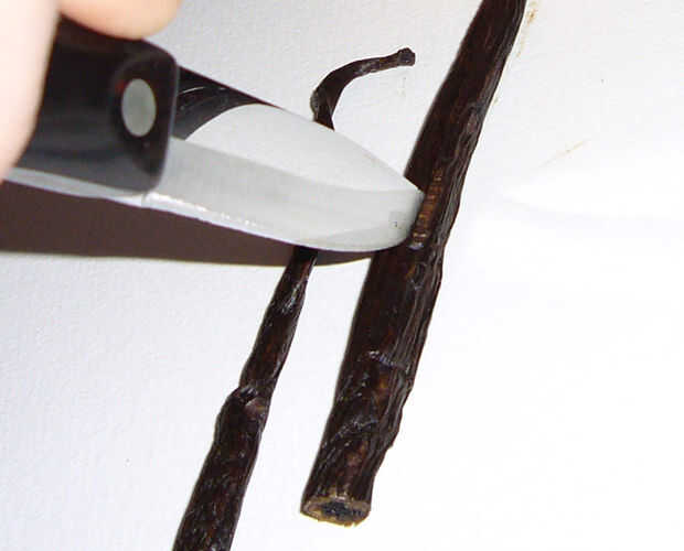 Cortar judías por la mitad. Corté por la mitad para que los granos permanecer sumergidos incluso si son largos o el nivel de vodka. Incluso pueden considerar cortar en cuartos para que ellos son a permanecer completamente sumergido, pero sólo hacerlo después de raspar los granos (paso 3) para salvarse agregado trabajo.