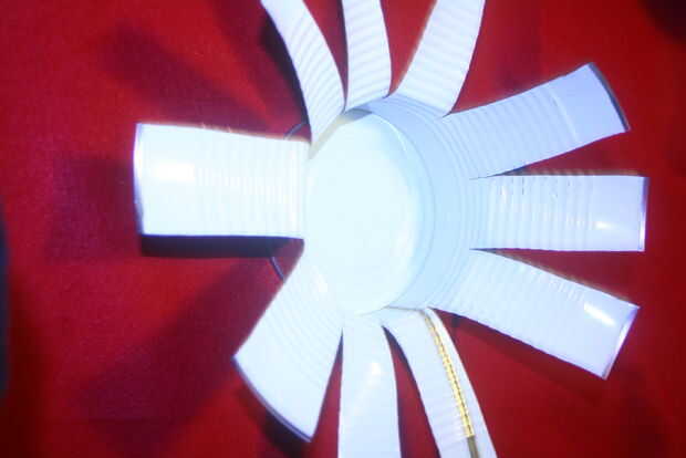 Con las tijeras cortadas simplemente líneas hacia abajo en el poder, seguir sus marcas o a mano alzada como lo hice. Reducirá hasta cerca de 3 pulgadas desde la parte inferior. Está la parte más difícil de cortar por el borde superior de la lata, el resto es muy corta. Una vez que todas las solapas cortar, empujar hacia fuera y hacia abajo creando una flor como la forma como en la foto tres. Los bordes de la lata se ser muy agudo tan tenga cuidado al doblar.