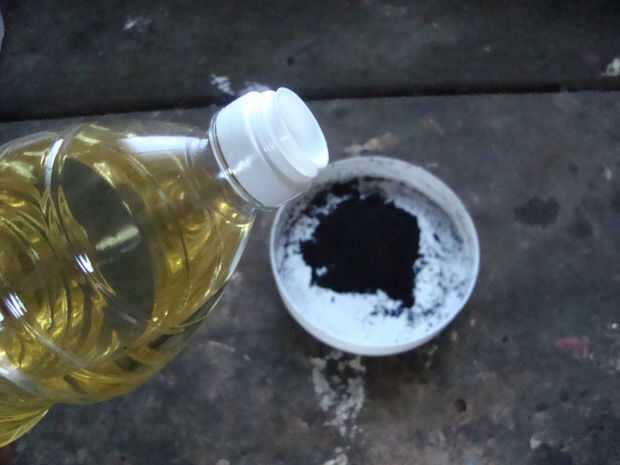Y despues de unir bien ambos polvos, le agregué un poco de aceite, para que no se diluya en el agua.