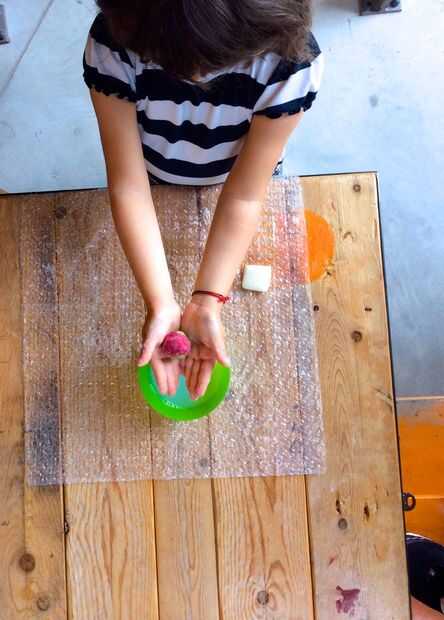 · Una vez completamente de fieltro, poner la bola en agua fría sin interrumpir el movimiento del balanceo con las manos
