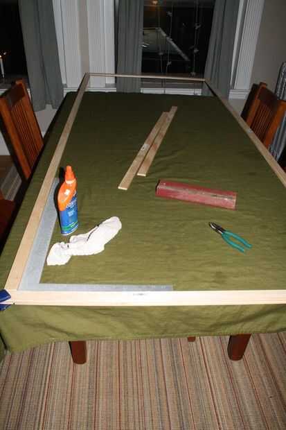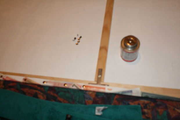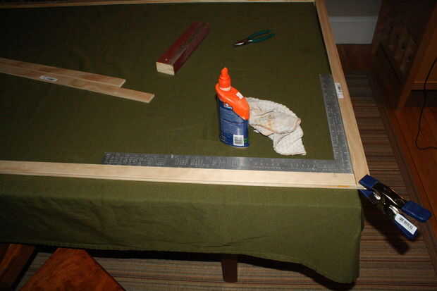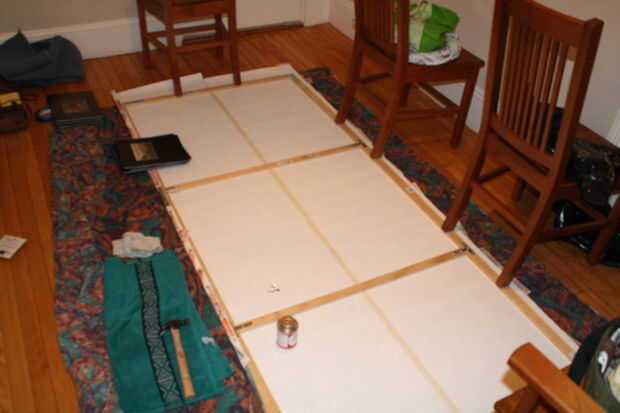 I laminado las tiras del enrejado junto para el marco y las esquinas estaban ligadas por soportes en forma de L. T soportes fueron utilizados para los soportes transversales. He pegado a un lado del marco y había presionado en la parte posterior del papel pintado. Se utilizaron sillas presionado mientras el pegamento seca.