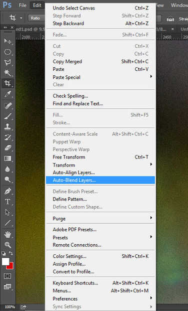 4. ir a Edición > fusionar capas automáticamente, seleccione en el menú nuevo, "pila de imágenes"