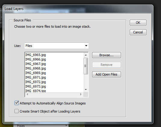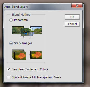 2. Seleccione todas las fotos de la toma de photostacking. y no olvides marcar el "intento de alinear automáticamente capas"