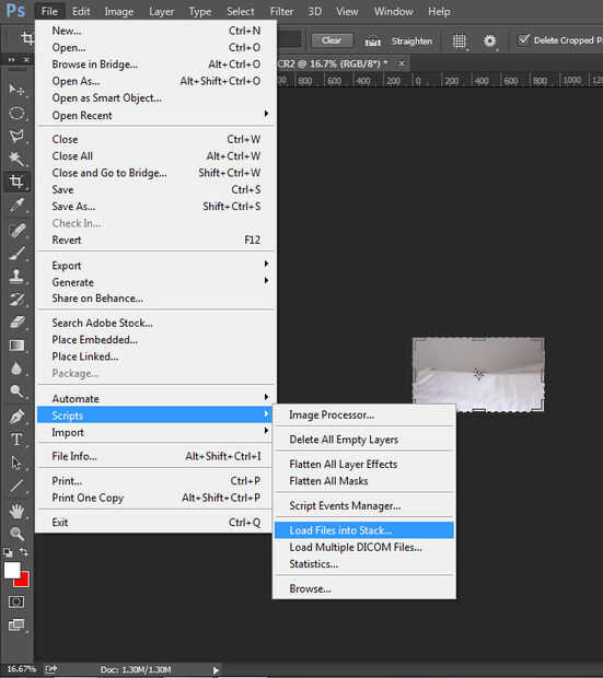 1. abrir photoshop, ir a archivo > secuencias de comandos > cargar archivos en una pila